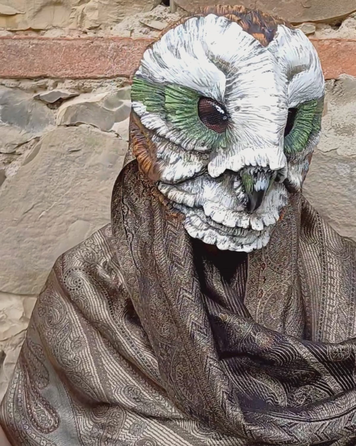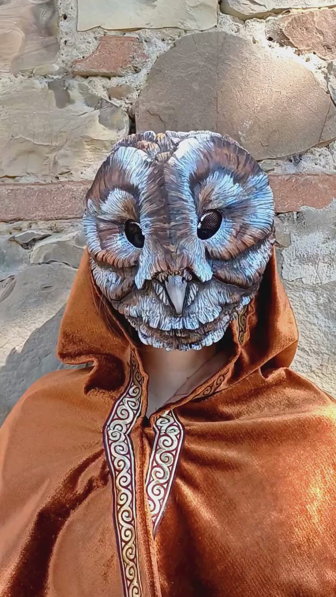 Fascinated by barn owls, I'm captivated by their mesmerizing shades. Their majestic presence and enchanting colors inspire my artistic pursuits. Drawn to encapsulate the rustic charm of these creatures, a unique resin mask with a detachable jaw. This mask stands out, offering versatility and style in one exquisite piece. With its innovative design and captivating colors, it will make a statement at any event or gathering. As they seamlessly blend into their surroundings, their velvety figures appear tailored for the wilderness, evoking a timeless sense of mystique and beauty.